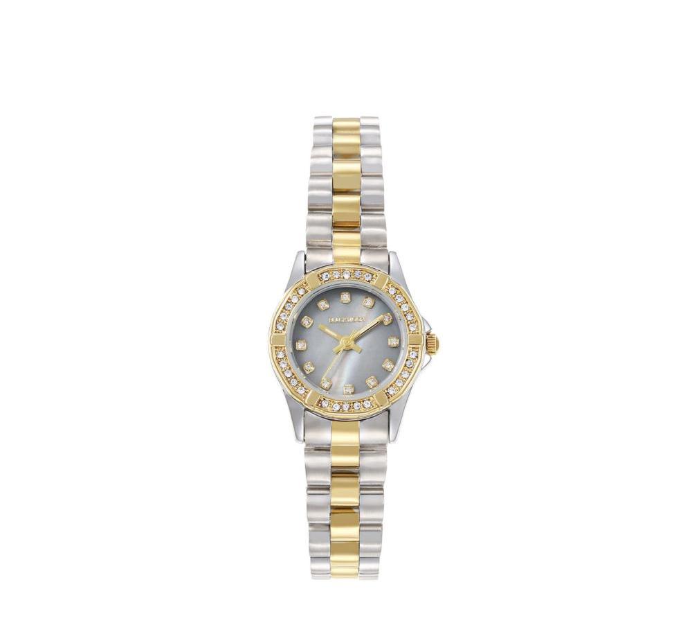 تتميز الساعة بميناء دائري أنيق بلون رمادي فاخر يضفي لمسة من العمق والرقي، محاط بإطار من الستانلس ستيل بلونين ذهبي وفضي فاخر .