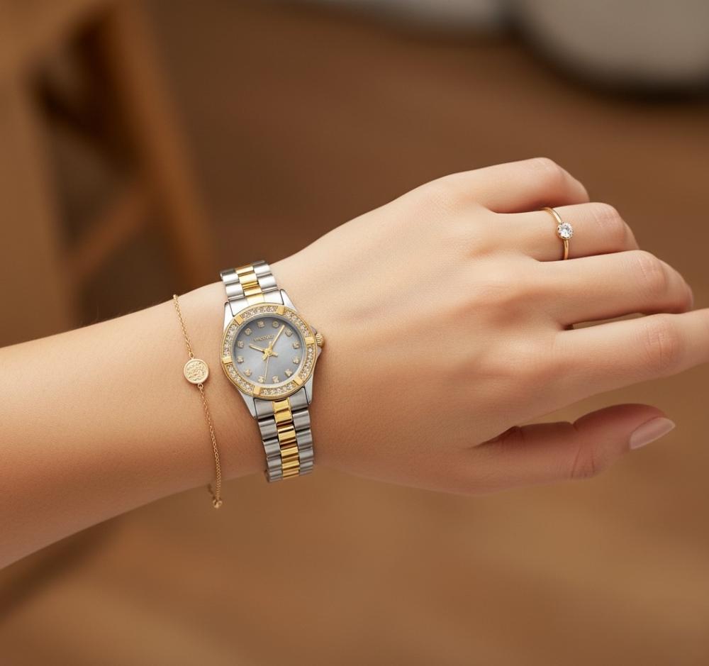 تألقي بإطلالة ساحرة مع هذه الساعة النسائية المصممة بذوق راقٍ، بإطار مرصع بالكريستال اللامع الذي يضفي لمسة أنثوية ناعمة وفخمة في آنٍ واحد.