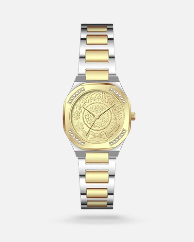 تتميز الساعة بميناء دائري أنيق بلون ذهبي فاخر يضفي لمسة من العمق والرقي، محاط بإطار من الستانلس ستيل مرصع بالكرستال اللامع بلون ذهبي وفضي فاخر .