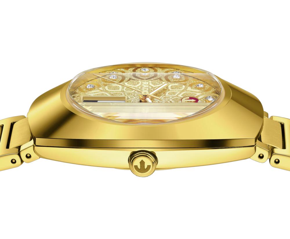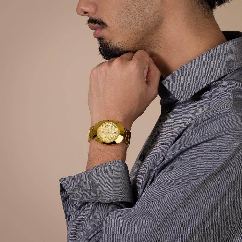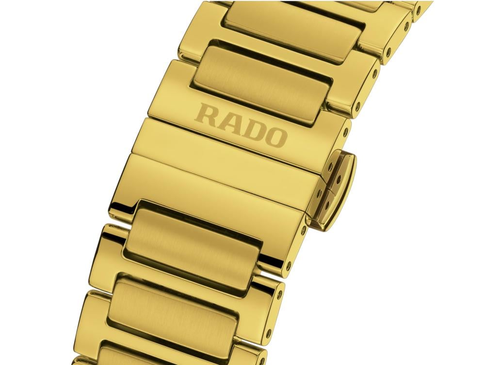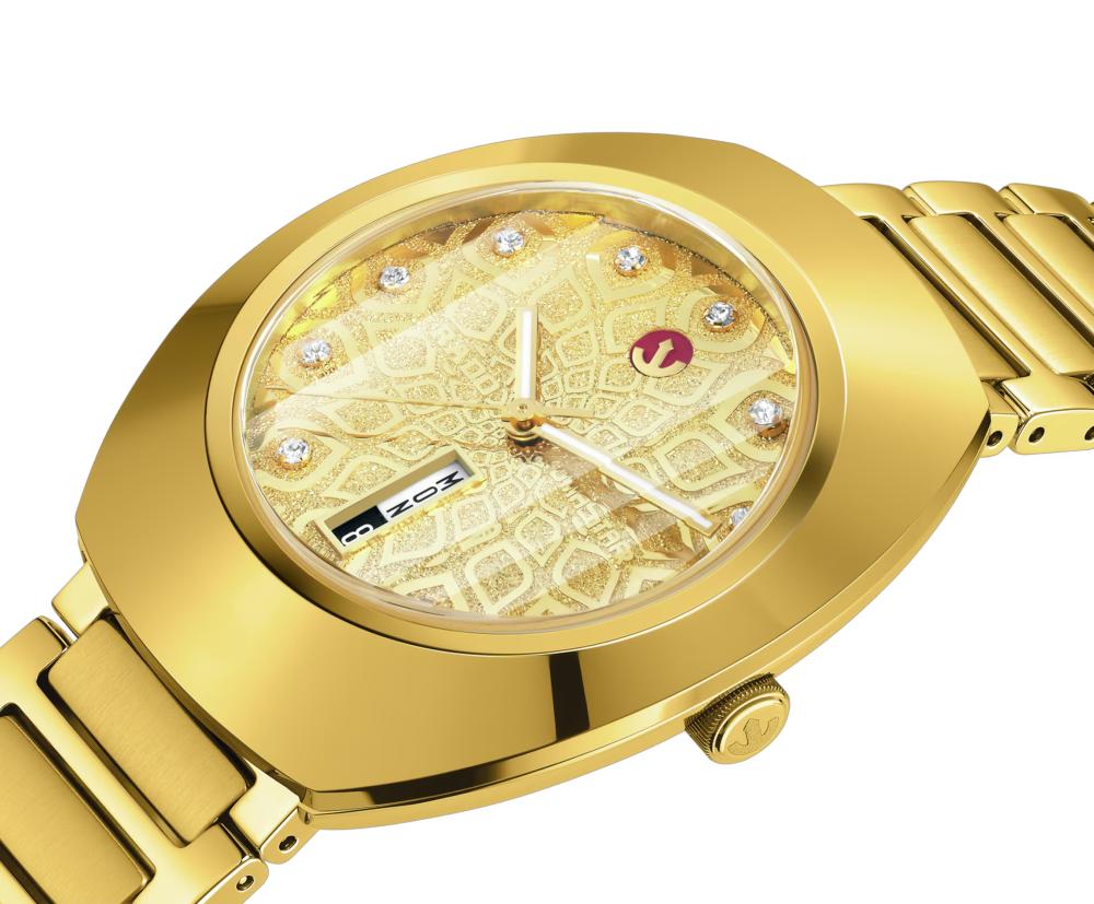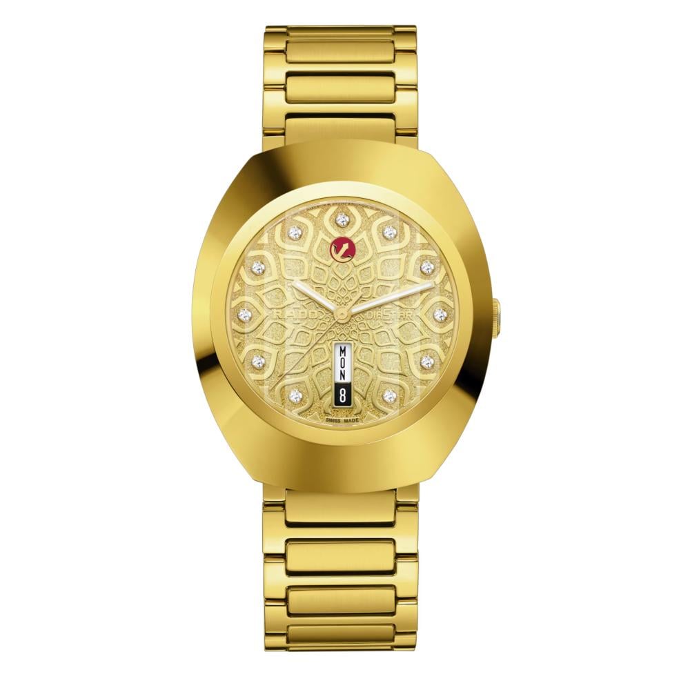 ساعة دياستار أوريجينال الفريدة بقطر 38 مم، وهي مقاومة للماء حتى عمق 100 متر. تتميز بإطار من السيراميك المصقول فائق اللمعان بلون الذهب الأصفر، بزوايا وتفاصيل مصقولة، فوق علبة من الفولاذ المقاوم للصدأ مطلية بمادة PVD بلون الذهب الأصفر، متناسقة معها. تتميز هذه الساعة الجميلة بزجاج ياقوتي عمودي متعدد الأوجه. تشمل المواصفات عقارب صفراء اللون مطلية بمادة Super-LumiNova® البيضاء، ومؤشرًا لليوم أبيض اللون وآخر للتاريخ أسود اللون. يتميز الميناء بإحدى عشرة حبة زركونيا مكعبة فاتحة اللون، على نمط متناغم أصفر اللون على زخرفة من مسحوق الماس. توفر حركة رادو R764 الأوتوماتيكية احتياطي طاقة يصل إلى 80 ساعة، مع زنبرك توازن Nivachron™ مضاد للمغناطيسية. السوار مصنوع من الفولاذ المقاوم للصدأ المصقول والممشط والمطلي بمادة PVD بلون الذهب الأصفر.