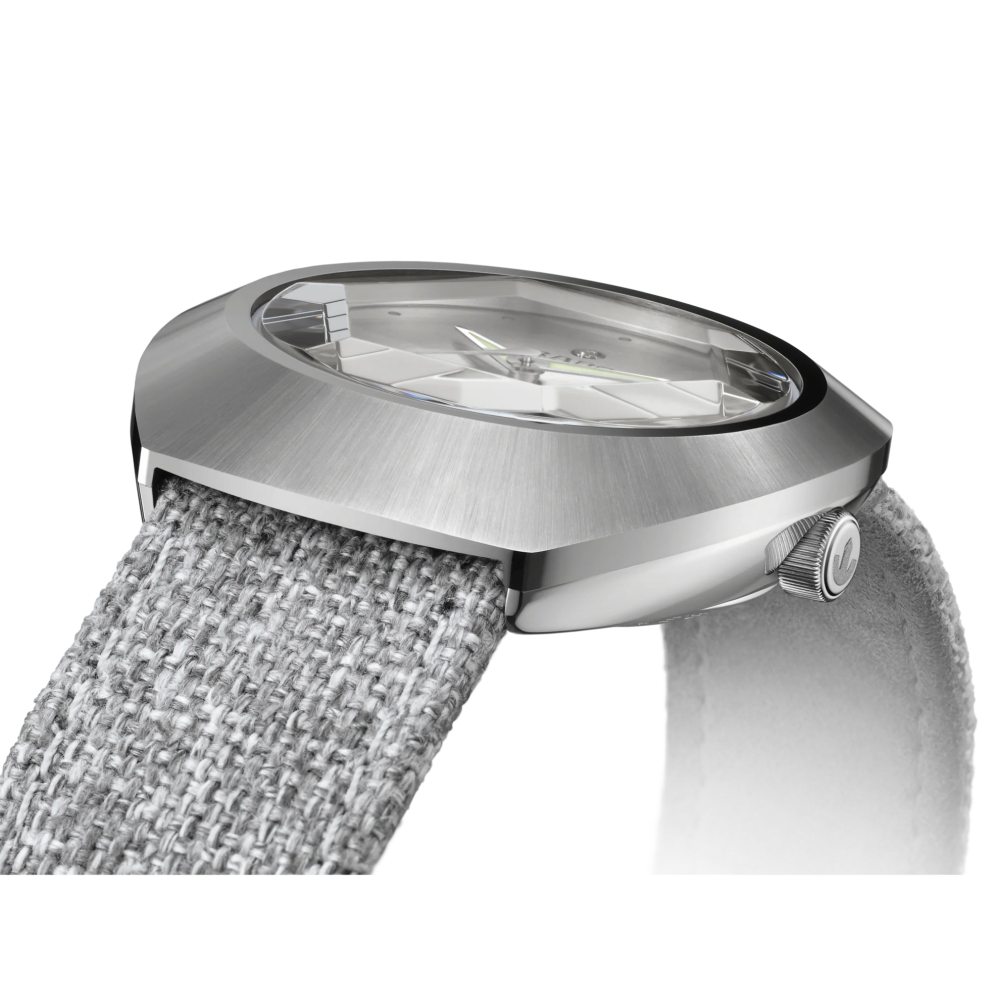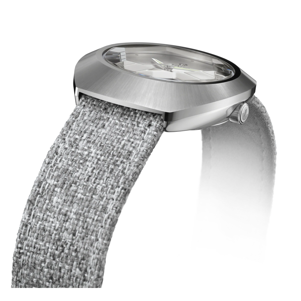 يتم تسليم الإصدار في حقيبة أنيقة باللون الرمادي مع **سوار شبكي من الفولاذ المقاوم للصدأ بتصميم “ميلانيزي”**، بالإضافة إلى حزام قماشي رمادي منقوش. بفضل نظام **EasyClip** يمكن تبديل الأحزمة بسهولة وسرعة لتغيير المظهر.