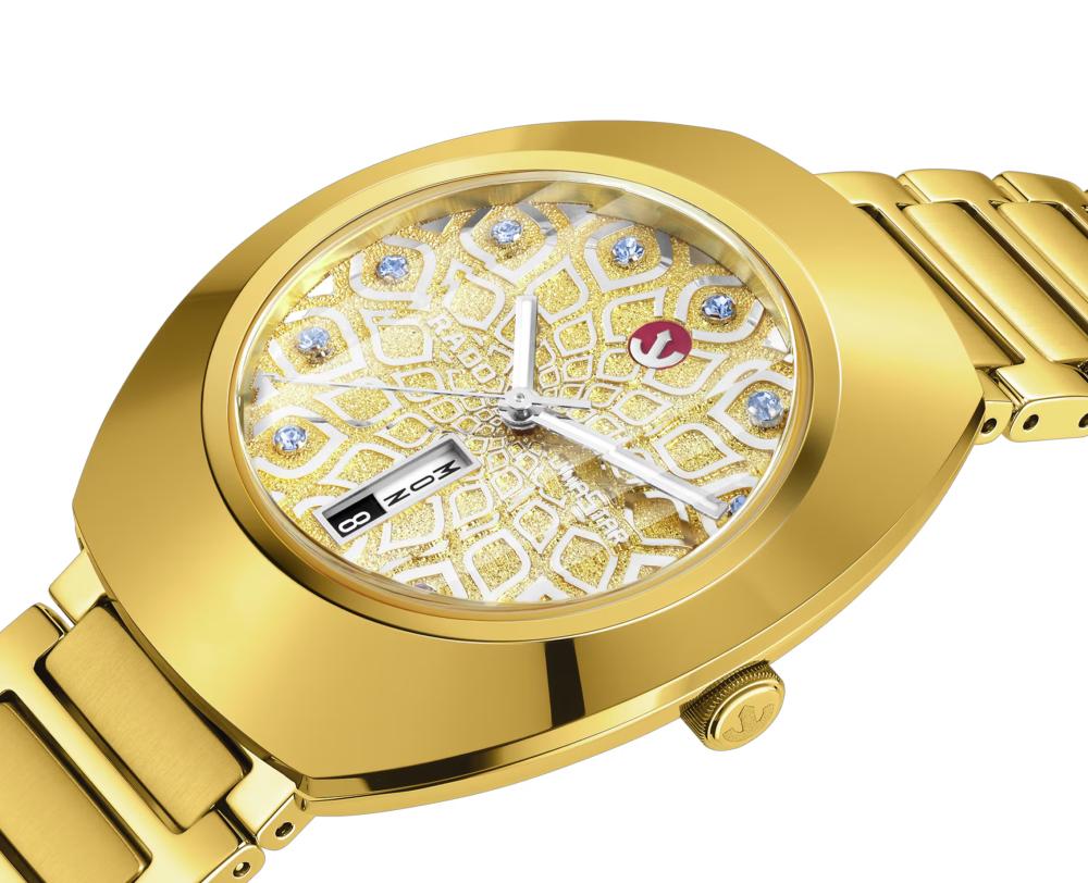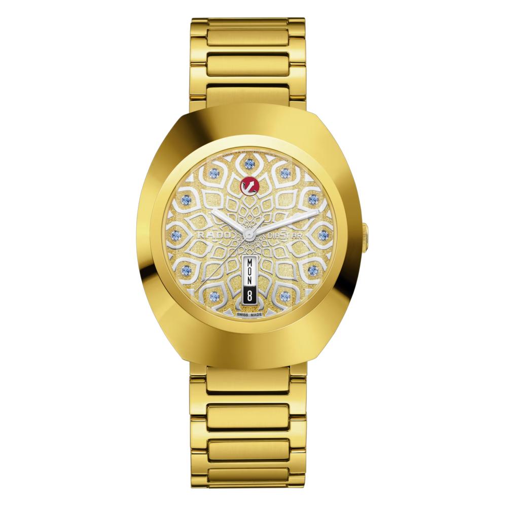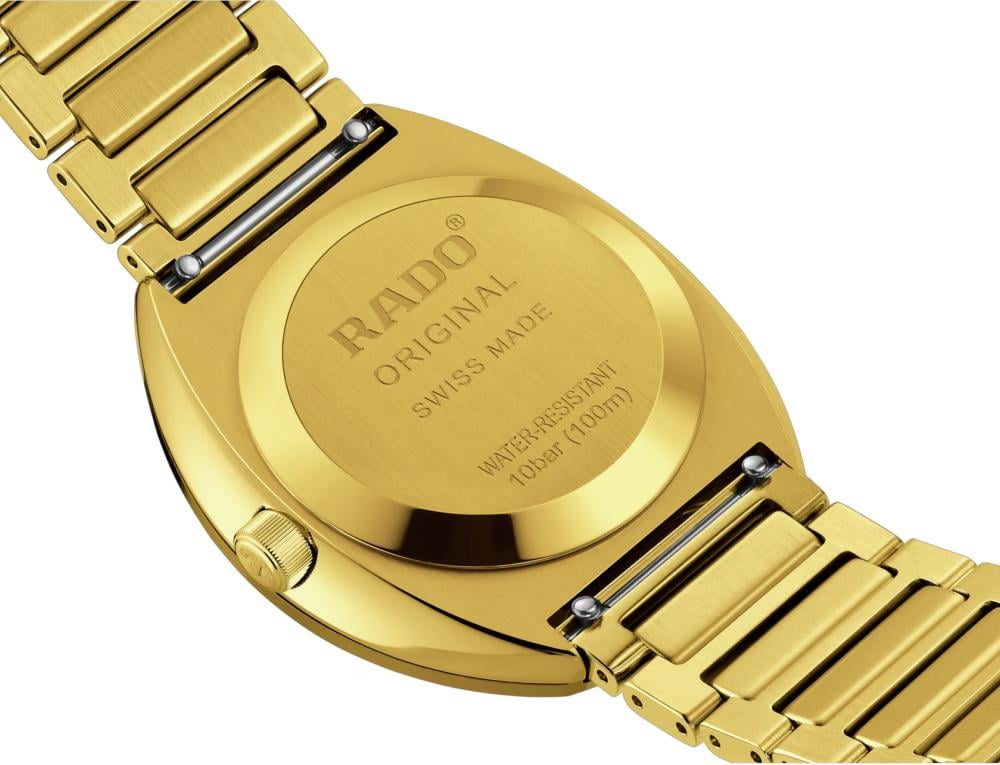 على نمط متناغم بلون الروديوم على زخرفة من مسحوق الماس. توفر حركة رادو R764 الأوتوماتيكية احتياطي طاقة يصل إلى 80 ساعة، مع زنبرك توازن Nivachron™ مضاد للمغناطيسية. السوار مصنوع من الفولاذ المقاوم للصدأ المصقول والممشط والمطلي بمادة PVD باللون الأصفر.