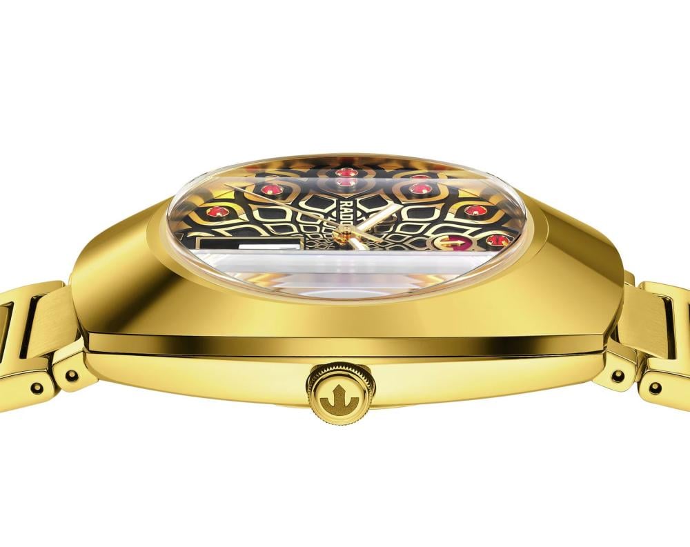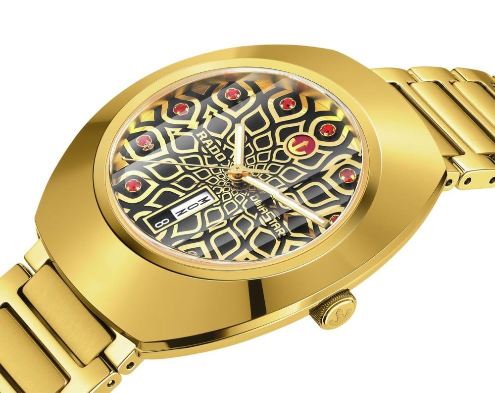 ساعة دياستار أوريجينال الفريدة بقطر 38 مم، وهي مقاومة للماء حتى عمق 100 متر. تتميز بإطار من السيراميك المصقول باللون الذهبي الأصفر فائق اللمعان، بزوايا وتفاصيل مصقولة، فوق علبة من الفولاذ المقاوم للصدأ مطلية بتقنية PVD بلون ذهبي أصفر مطابق. تتميز هذه الساعة الجميلة بزجاج ياقوتي عمودي متعدد الأوجه. تشمل المواصفات عقارب ذهبية صفراء مطلية بمادة سوبر لومينوفا بيضاء، ومؤشر نهار أبيض وآخر تاريخ أسود. يتميز الميناء بإحدى عشرة حجر زركونيا مكعب أحمر، على نمط متناغم أصفر اللون على خلفية سوداء. توفر حركة رادو R764 الأوتوماتيكية احتياطي طاقة يصل إلى 80 ساعة، مع زنبرك توازن Nivachron™ مضاد للمغناطيسية. السوار مصنوع من الفولاذ المقاوم للصدأ المصقول والممشط والمطلي بتقنية PVD باللون الذهبي الأصفر
