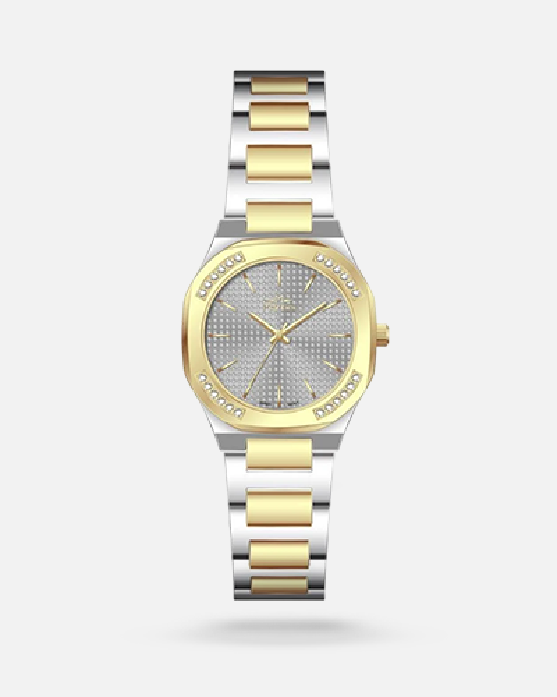 تتميز الساعة بميناء دائري أنيق بلون الرصاصي يضفي لمسة من العمق والرقي، محاط بإطار من الستانلس ستيل مرصع بالكرستال اللامع بلون ذهبي وفضي فاخر .